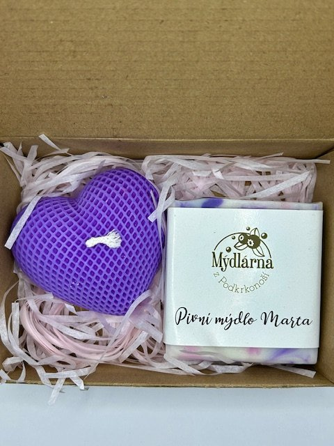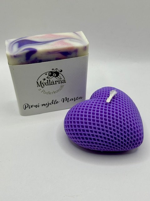 Voňavý dárek, který potěší srdce i kůži. Balíček obsahuje ručně vyráběné Pivní mýdlo Marta s jemnou pěnou a blahodárnými účinky sladu a chmele - pro pokožku, která si zaslouží péči bez kompromisů. K tomu fialová sójová svíčka, která rozzáří každý příjemný večer příjemným světlem a hřejivou atmosférou.
